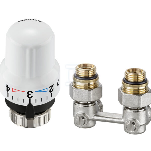 Głowica termostatyczna DU, biała oraz Zestaw przyłączeniowy Vekotrim G3/4-1/2 do grzejników dolnozasilanych, z wkładką termostatyczną i funkcją odcięcia, prosty o