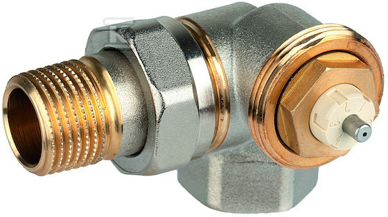 Zawór termostatyczny, kątowy, wkładka SX, z nastawą wstępną, 1/2″, gwint wewnętrzny, ze złączką do grzejnika z uszczelnieniem miękkim o numerze