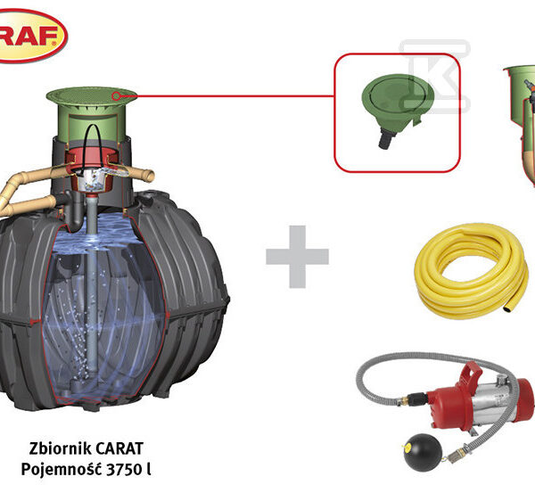 Zestaw na deszczówkę OGRÓD KOMFORT 3750L=zbiornik podziemny CARAT 3750L z nabudową MAX dn110+filtr wewnętrzny+uspakajacz wlewu+syfon+pokrywa teleskopowa D600, ruch pieszy, z