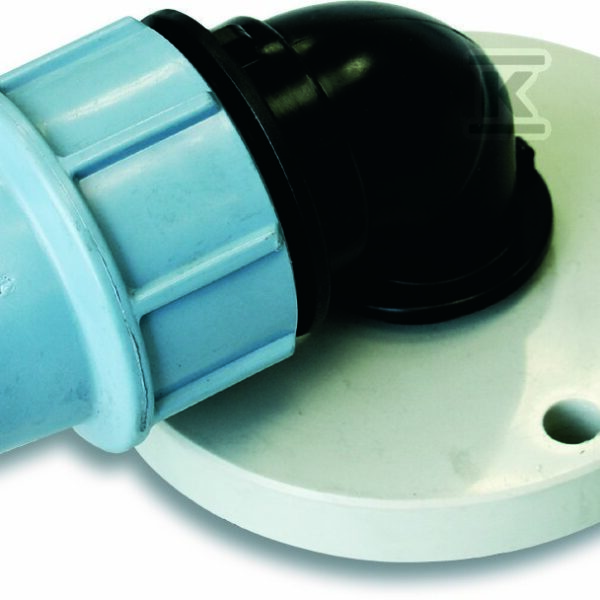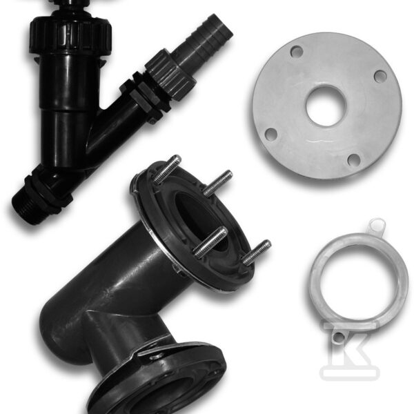 Przyłącze podstawowe (kolano przyłączeniowe + zawór zamykający z uszczelką i śrubami) do zbiorników naziemnych na deszczówkę o numerze katalogowym 1115001287