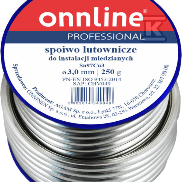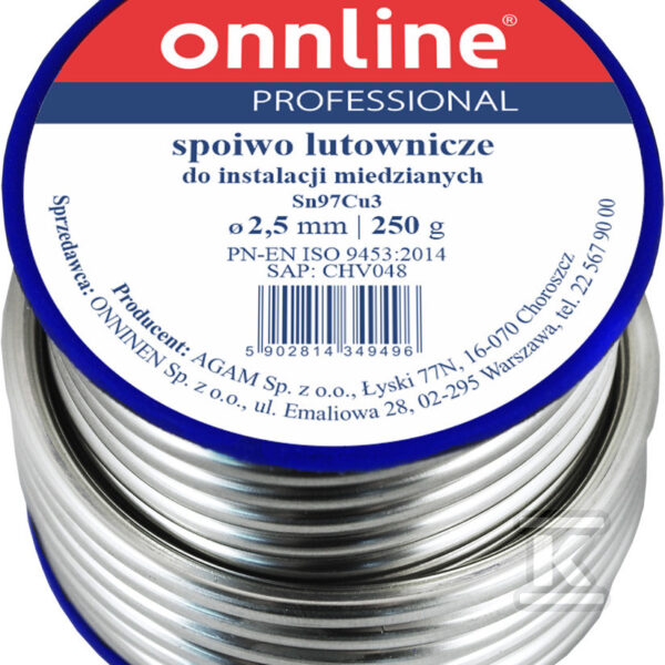 Spoiwo lutownicze/lut miękki Sn97Cu3 2,5mm 250g o numerze katalogowym 1030002 w kategorii Luty miękkie, Luty. Produkt wyprodukowany przez markę ONNLINE.