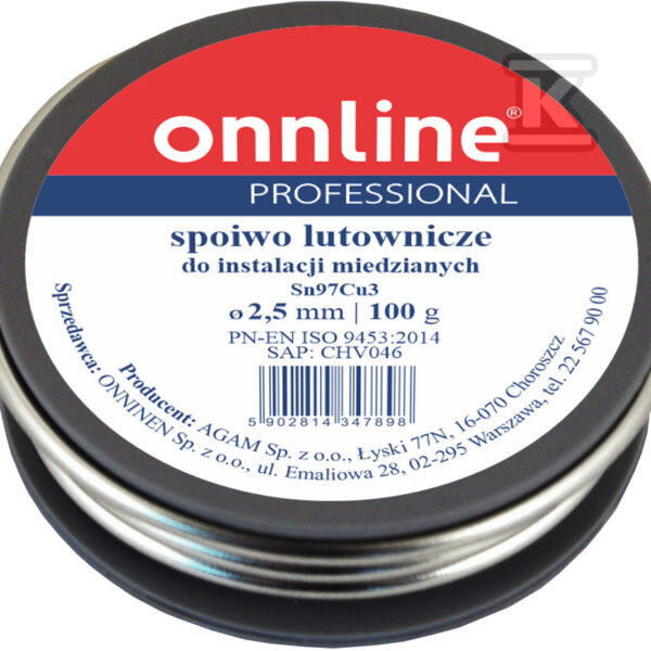 Spoiwo lutownicze/lut miękki Sn97Cu3 2,5mm 100g o numerze katalogowym 1030004 w kategorii Luty miękkie, Luty. Produkt wyprodukowany przez markę ONNLINE.