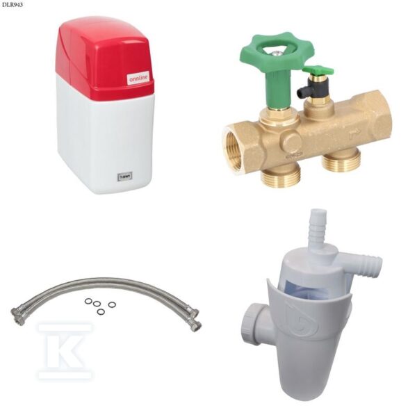 Zmiękczacz kompaktowy z elektronicznym sterowaniem objętościowym NEW ONNLINE 20 w zestawie razem z armaturą przyłączeniową MULTIBLOCK INLINE, wężami przyłączeniowymi 25/20