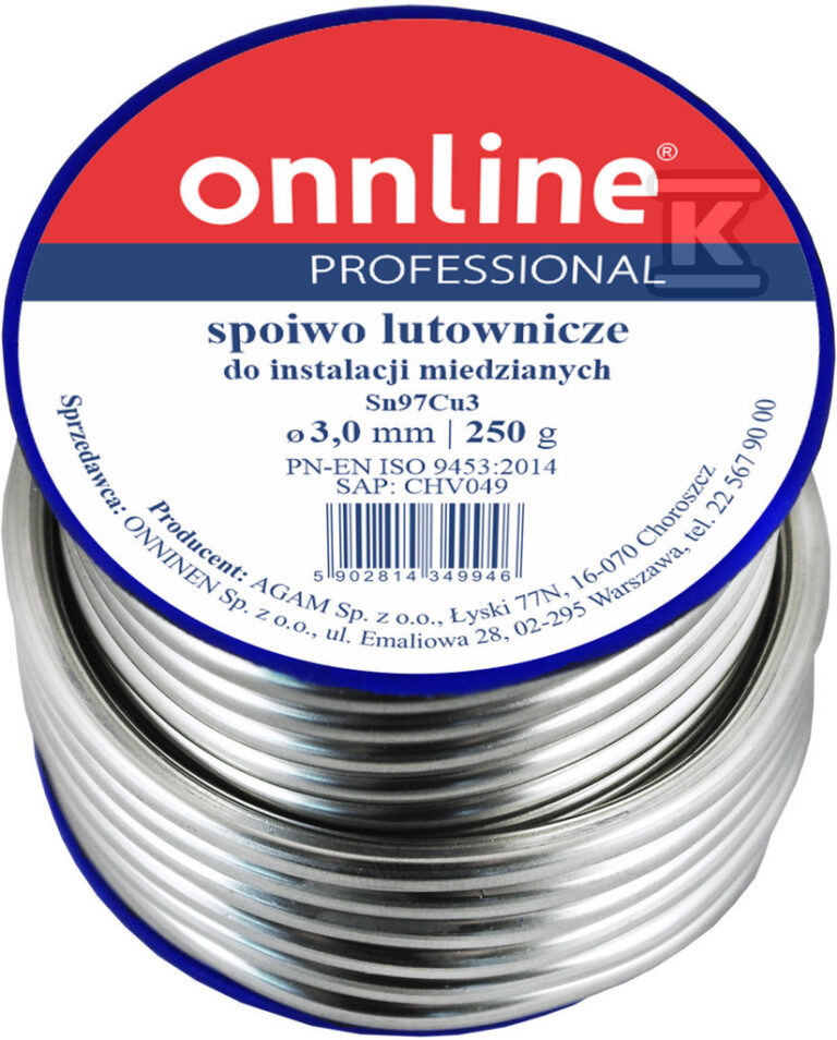 Spoiwo lutownicze/lut miękki Sn97Cu3 2,5mm 250g o numerze katalogowym 1030002 w kategorii Luty miękkie, Luty. Produkt wyprodukowany przez markę ONNLINE.
