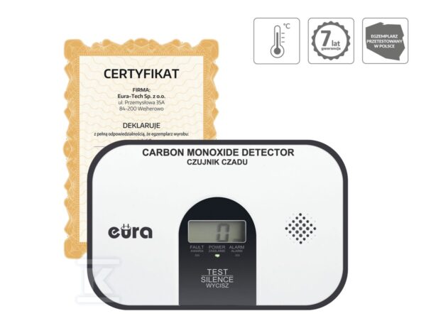 Czujnik czadu „EURA” CD-72A2v7300/B o numerze katalogowym   A21A456 w kategorii Czujniki p.poż.domowe>Czujniki tlenku węgla. Produkt wyprodukowany przez markę EURA-TECH,