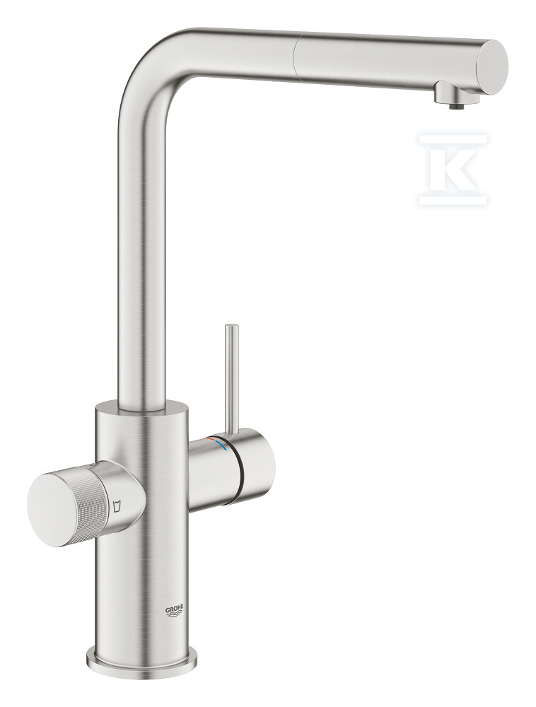 Bateria filtrująca Grohe Blue Pure Minta z wyciąganą, obracaną w zakresie 360° wylewką „L”, stal nierdzewna o numerze katalogowym 30590DC0 w kategorii Baterie zlewozmywakowe stojące, Baterie kuchenne. Produkt wyprodukowany przez markę GROHE, seria GROHE BLUE.