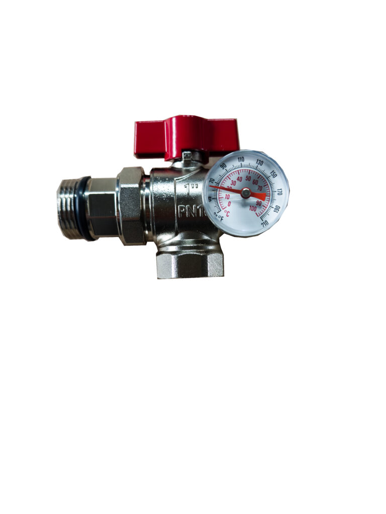 Zawór z termometrem i półśrubunkiem kątowy 1″ czerwony