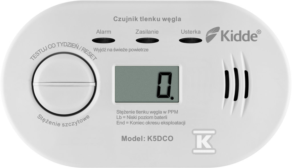 Czujnik czadu z wyświetlaczem Kidde K5DCO o numerze katalogowym KID-K5DCO w kategorii Czujniki tlenku węgla, Czujniki p.poż.domowe. Produkt wyprodukowany przez markę KIDDE, seria 5.