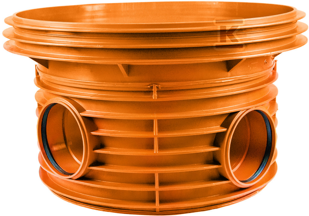 Kineta PP 800×200+P200, typ4 przelotowa z dopływem prawym 270st., do pierścienia wznoszącego 800mm oraz rur wlotowych gładkich 200mm+prawy dopływ 200mm, bez uszczelki, kolor pomarańczowy (Diamir 800) o numerze katalogowym 2624139030 w kategorii Kinety przepływowe, Kinety. Produkt wyprodukowany przez markę KACZMAREK, seria Diamir DN/ID 800 (korugowana).