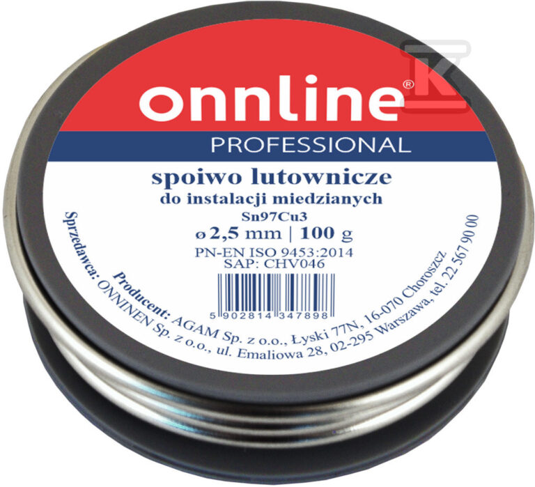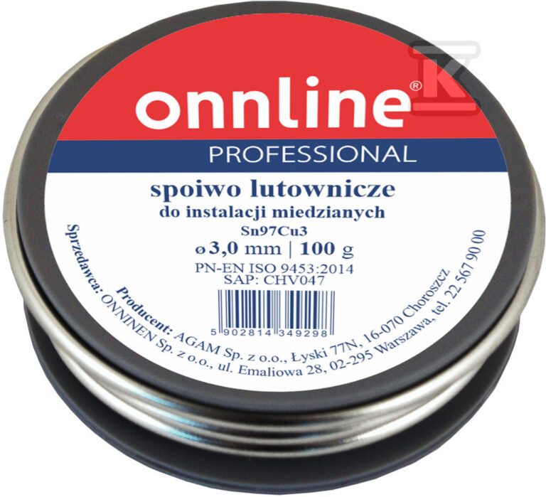 Spoiwo lutownicze/lut miękki Sn97Cu3 3,0mm 250g o numerze katalogowym 1030003 w kategorii Luty miękkie, Luty. Produkt wyprodukowany przez markę ONNLINE.