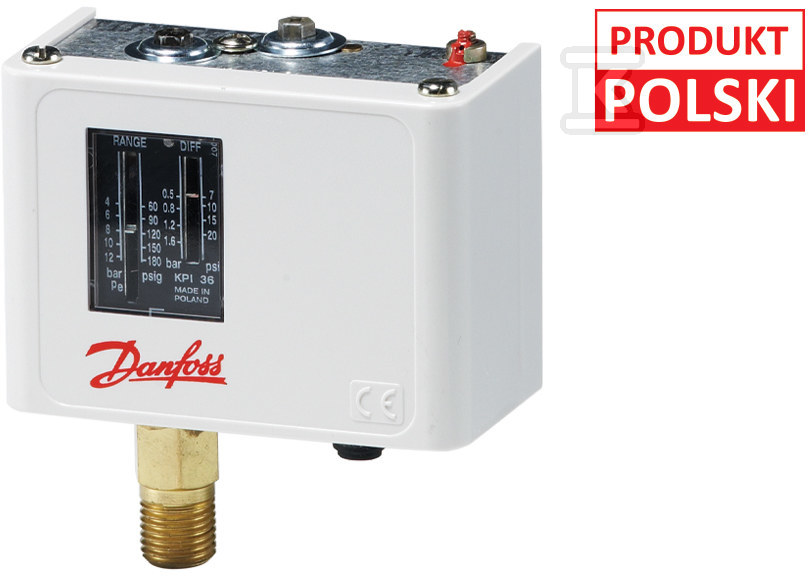 Presostat typu KP36, zakres od 2 do 14 bar, mechaniczna różnica załączeń: 0,7 do 4 bar o numerze katalogowym 060-110866 w kategorii Akcesoria elektryczne do pomp, Pompy instalacyjne. Produkt wyprodukowany przez markę DANFOSS, seria KP.