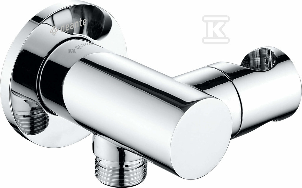 Przyłącze kątowe okrągłe z uchwytem na słuchawkę Cascada, chrom o numerze katalogowym   NAC_057K w kategorii Zestawy prysznicowe>Węże prysznicowe i przyłącza. Produkt wyprodukowany przez markę DEANTE, seria CASCADA.