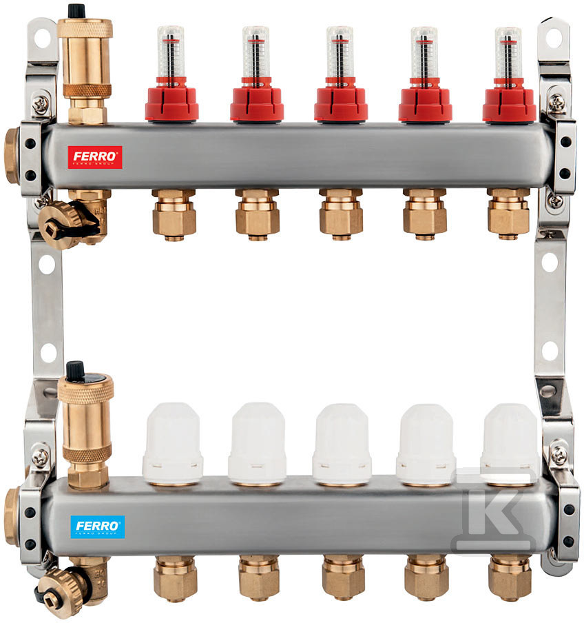Rozdzielacz 11-drogowy z zaworami termostatycznymi, przepływomierzami i złączkami, stal nierdzewna o numerze katalogowym   SN-RZP11S w kategorii Pozostałe systemy>Rozdzielacze pozostałe systemy. Produkt wyprodukowany przez markę FERRO, seria -.