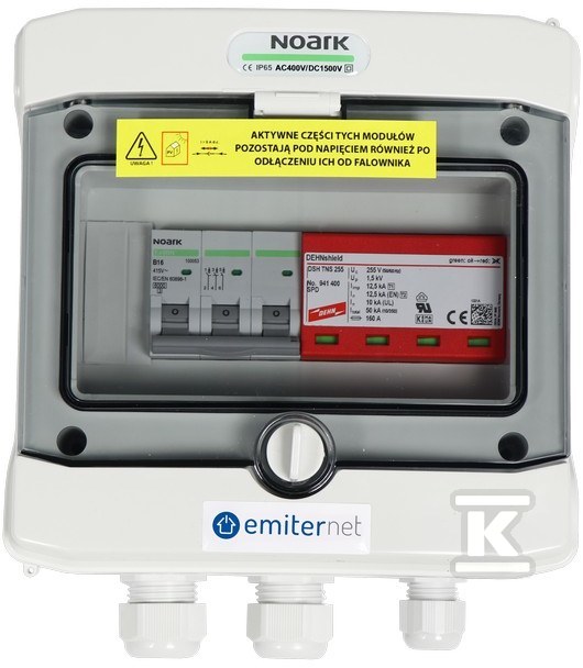 Rozdzielnica hermetyczna EMITER z ogranicznikiem przepięć AC typ 1+2, B16A 3F o numerze katalogowym EM-232_AC w kategorii Obudowy, Zabezpieczenie instalacji. Produkt wyprodukowany przez markę EMITER, seria ZABEZPIECZENIE INSTALACJI.
