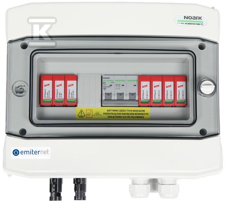 Rozdzielnica DC/AC hermetyczna EMITER z ogranicznikiem przepięć DC Dehn 1000V typu 2, 1 x łańcuch PV, 1 x MPPT, ogranicznik AC typ 2, B20A 3F o numerze katalogowym EM-41_DCAC w kategorii Obudowy, Zabezpieczenie instalacji. Produkt wyprodukowany przez markę EMITER, seria ZABEZPIECZENIE INSTALACJI.