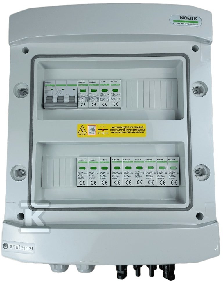 Rozdzielnica DCAC hermetyczna IP65 EMITER z ogranicznikiem przepięć DC Noark 1000V typu 2, 3 x MPPT / ogr. AC Noark typ 2, 40A 3-F o numerze katalogowym   EM-149N_DCAC w kategorii Zabezpieczenie instalacji>Obudowy. Produkt wyprodukowany przez markę EMITER.