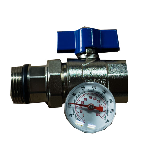 Zawór z termometrem i półśrubunkiem prosty 1″ niebieski