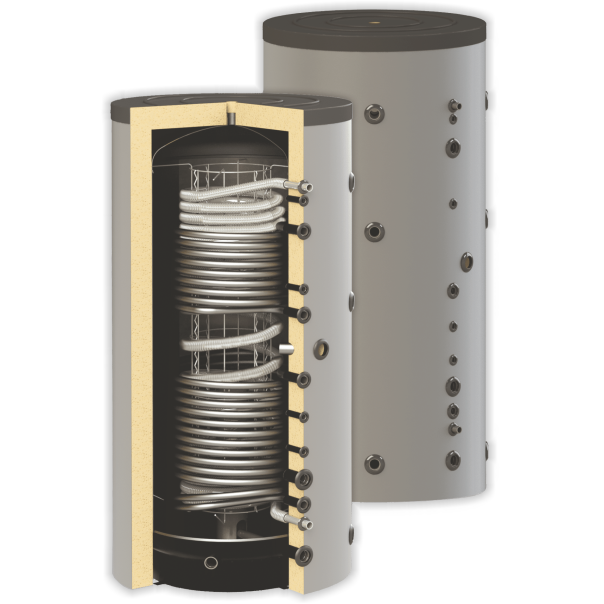 Model V2 HP 322 G z dwiema wężownicami, przeznaczony do współpracy z pompami ciepła oraz wysokotemperaturowym źródłem ciepła.