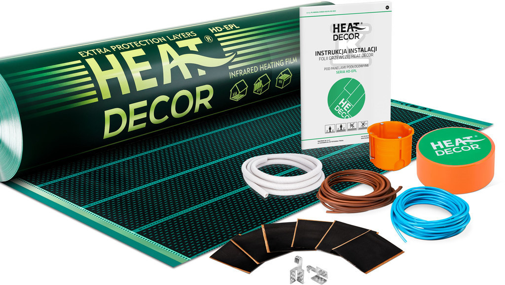 Zestaw folii grzewczej HD-EPL 80 W/m², szerokość 100 cm – bez termostatu – konektor BX – 18m² o numerze katalogowym Z/EPL80/BT/BX/18 w kategorii Zestawy folii grzewczych, Folie grzewcze. Produkt wyprodukowany przez markę HEAT DECOR.