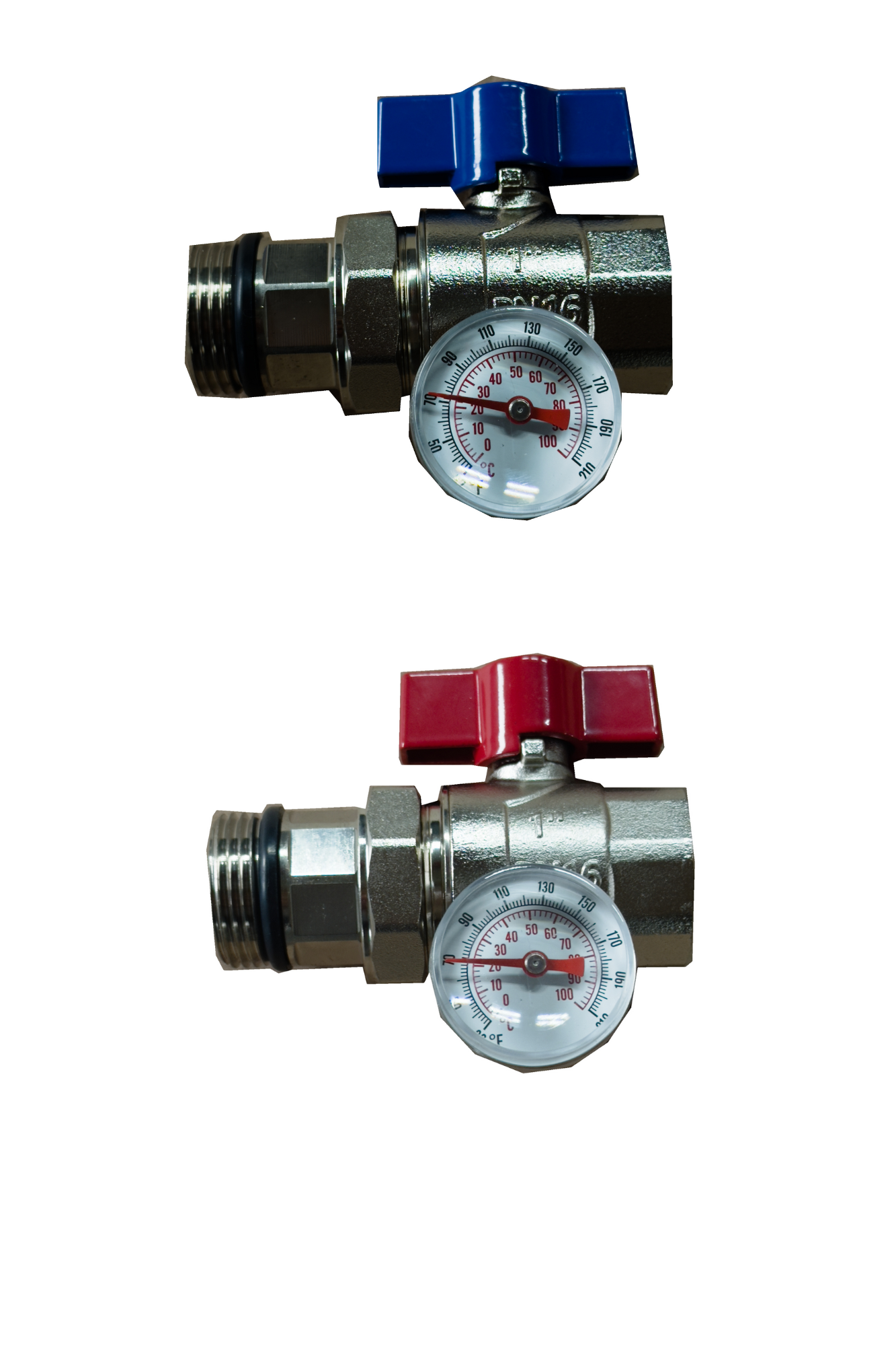 Zawór z termometrem i półśrubunkiem prosty 1″ niebieski
