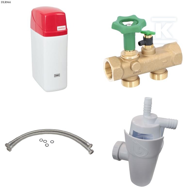 Zmiękczacz kompaktowy z elektronicznym sterowaniem objętościowym NEW ONNLINE 20 w zestawie razem z armaturą przyłączeniową MULTIBLOCK INLINE, wężami przyłączeniowymi 25/20 oraz syfonem do odprowadzania popłuczyn o numerze katalogowym   DLR944 w kategorii Zmiękczacze wody>Zmiękczacze kompaktowe. Produkt wyprodukowany przez markę ONNLINE.